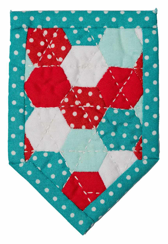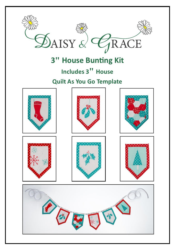 The kit includes fabrics (with extras to make more pennants), 3" QAYG House template (which also includes a free advent calendar pattern), 3 x DMC threads, Pack of Prym embroidery needles, 2m ribbon, freezer paper, Bondaweb, wadding, patterns and instructions.