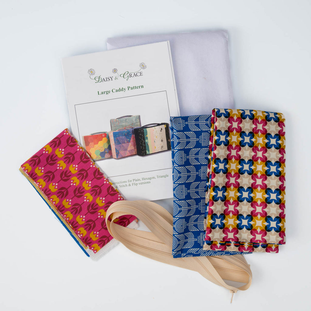 The kit includes instructions illustrated with photographs and diagrams, patterns, all the fabrics and interlining and zip to make the Large Caddy.